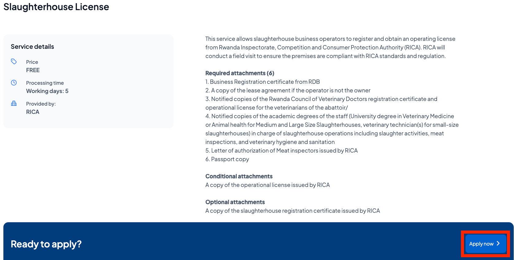 This service allows businesses operating slaughterhouses to register them and comply with Rwanda Inspectorate, Competition and Consumer Protection Authority regulation (RICA). This registration certificate is then used to obtain an operating license.