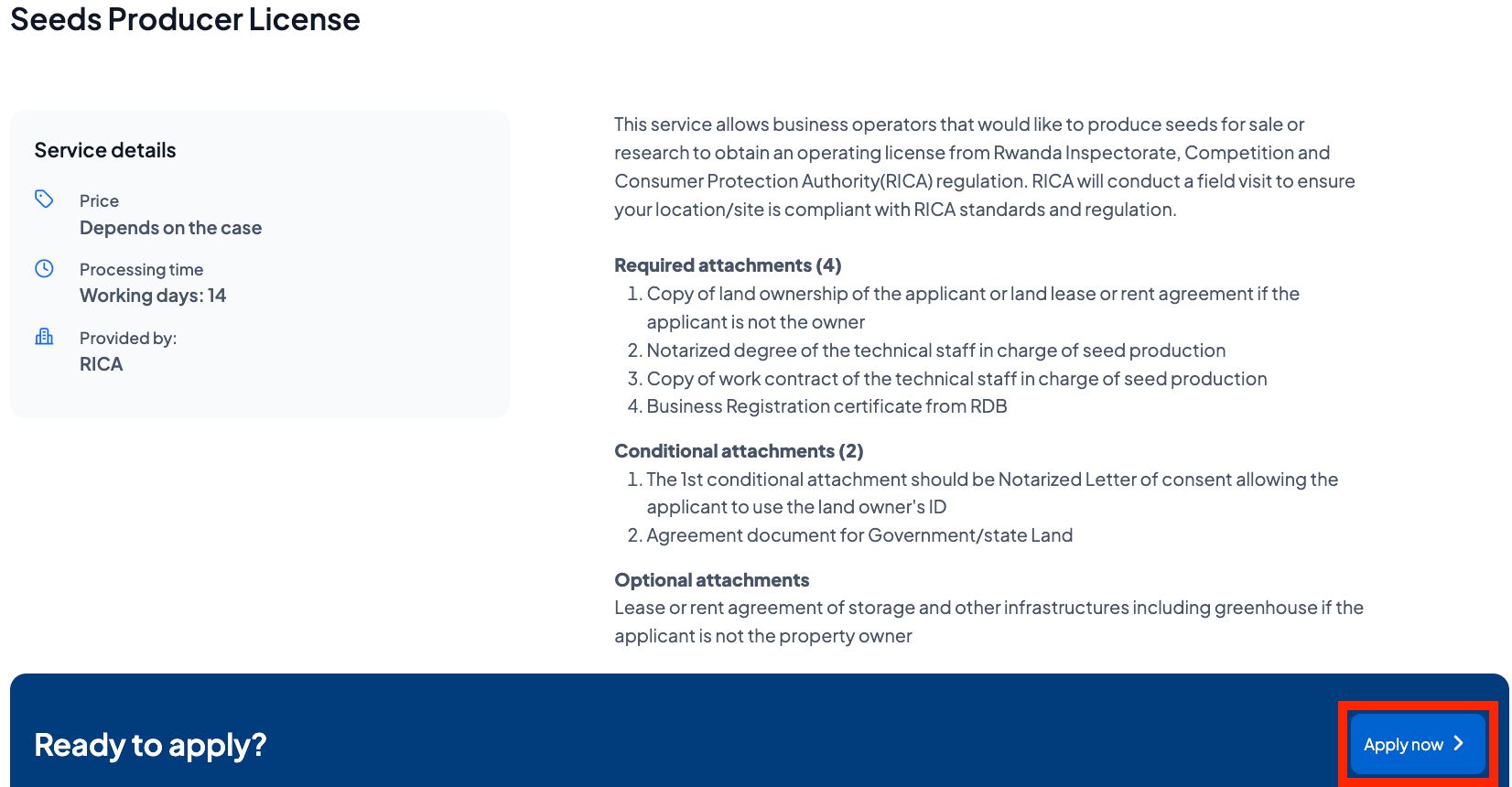This service allows business operators who want to produce seeds for sale or research to obtain an operating license from Rwanda Inspectorate, Competition and Consumer Protection Authority (RICA) regulation. RICA will conduct a field visit to ensure your location/site is compliant with RICA standards and regulations.