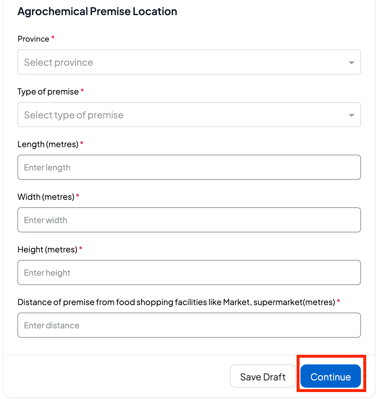 5. Enter information about the application type,Business details and premise location as prompted and click continue