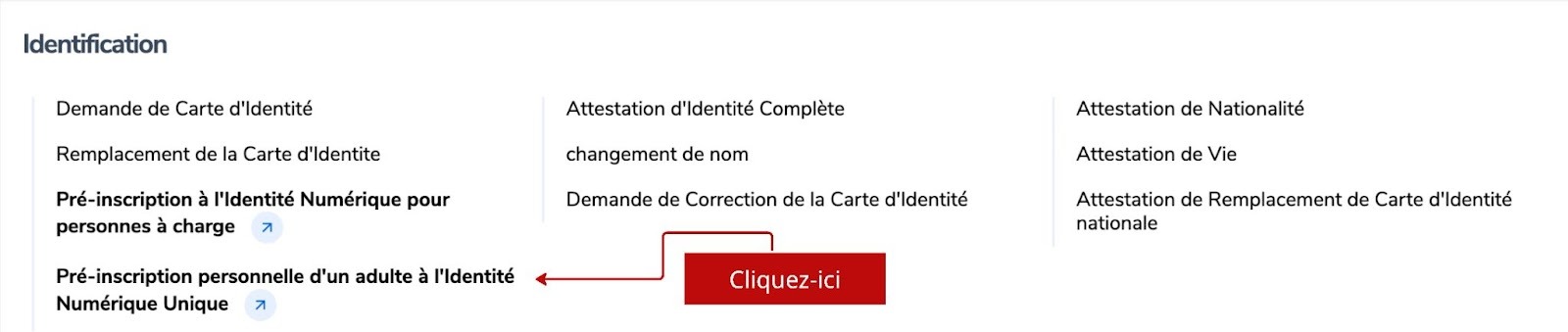 Faites défiler sous la catégorie Identification, puis cliquez sur Pré-inscription personelle d’un adulte à l'Identité Numérique .