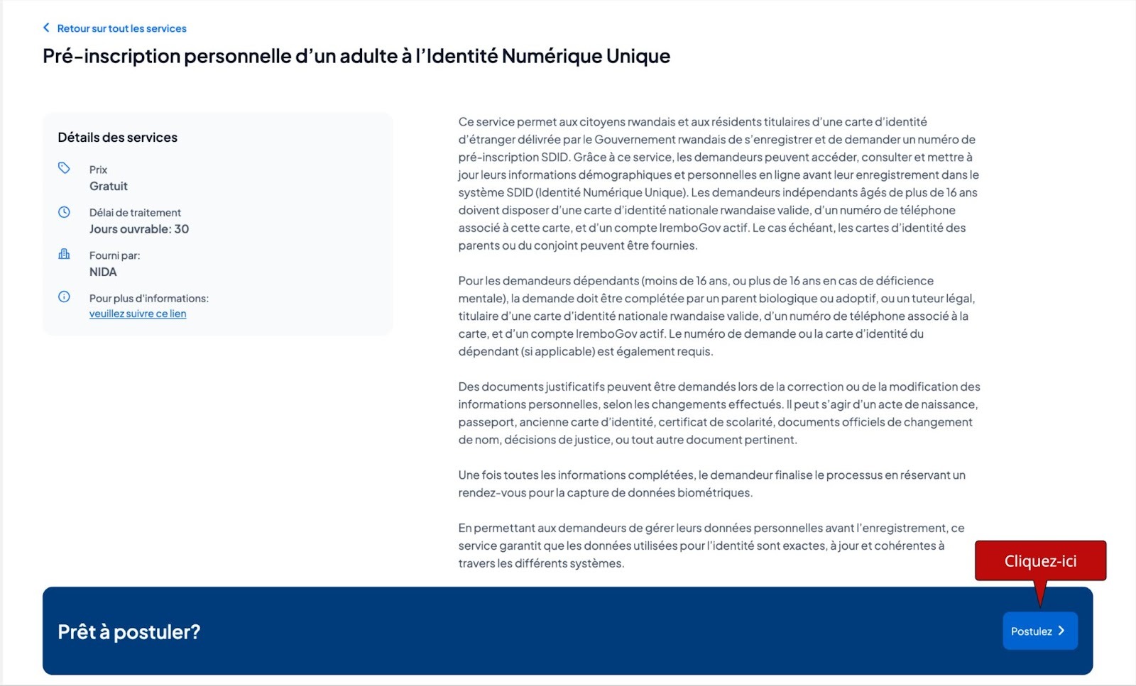 Vous devez avoir une carte d'identité nationale, une carte d'identité d'étranger ou un numéro de demande NIDA.