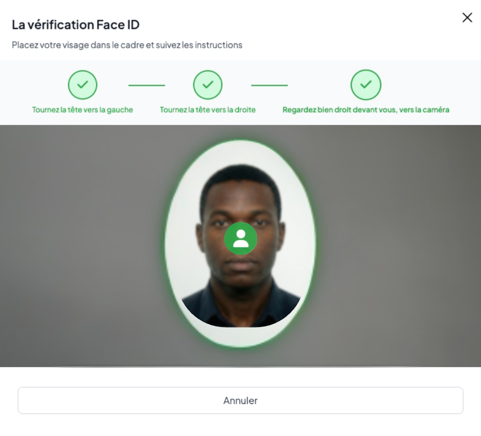 Vérification de l'identité faciale : utilisez la reconnaissance faciale pour vérifier votre identité en toute sécurité en suivant les instructions à l'écran.