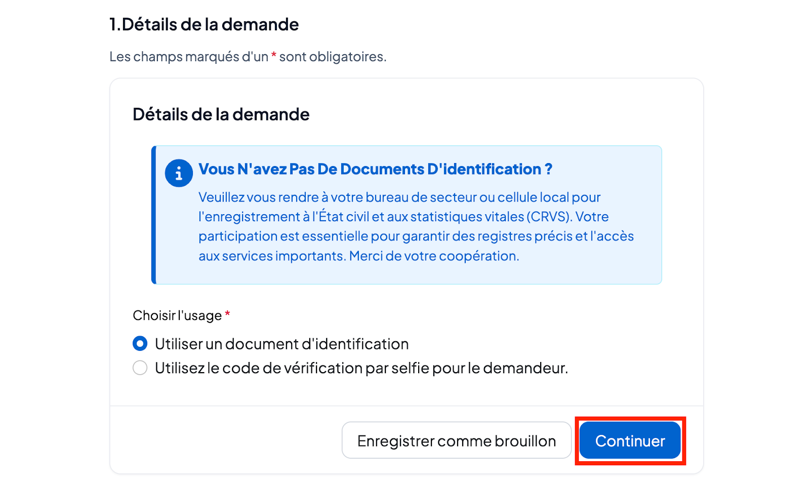 Sélectionner l'option correspondant à votre méthode de candidature, soit par un document d'identification, soit par un code selfie, puis cliquez sur “Continuer” pour poursuivre.