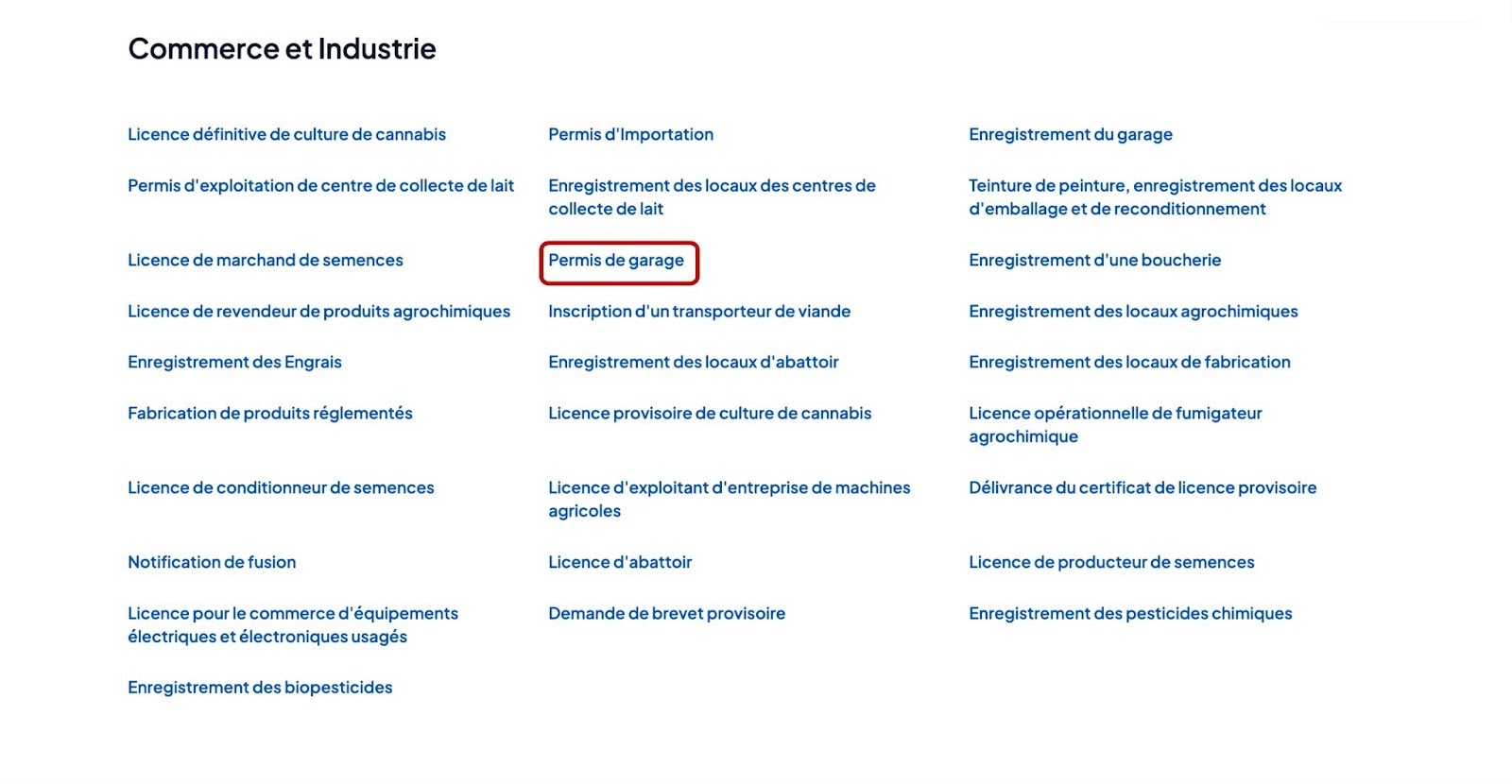 Accédez à la catégorie “Commerce et Industrie”, puis cliquez sur “Permis de garage” .