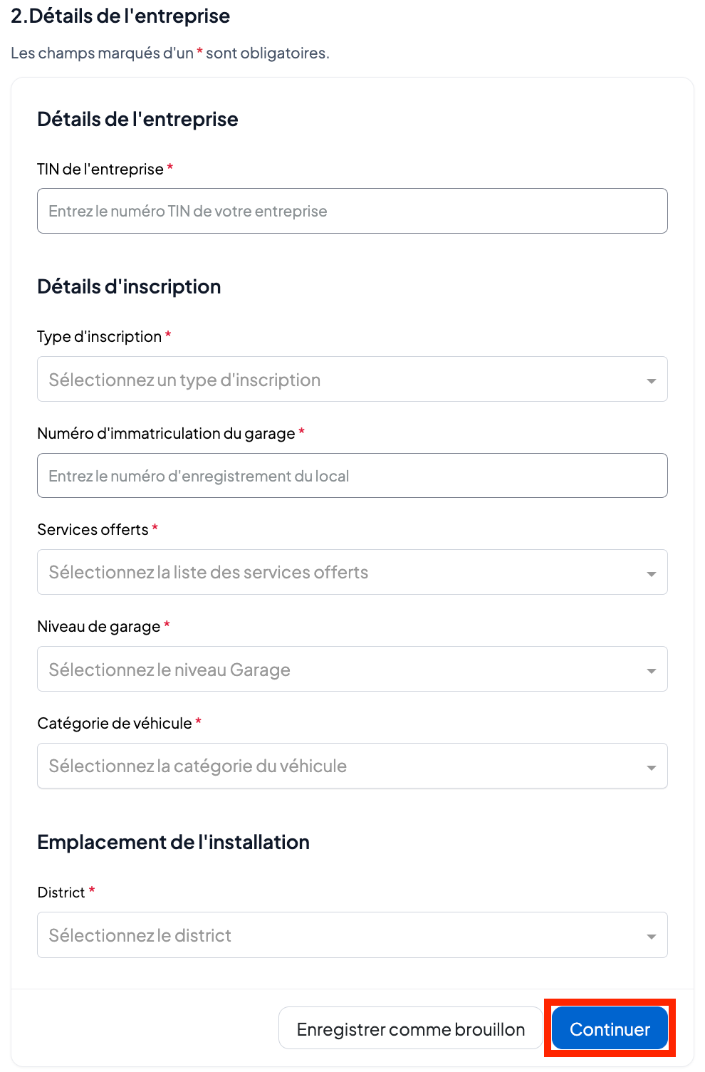 Saisissez les informations sur l’entreprise, sélectionnez s’il s’agit d’une nouvelle demande ou d’une demande de renouvellement de licence, et remplissez le TIN de l’entreprise.