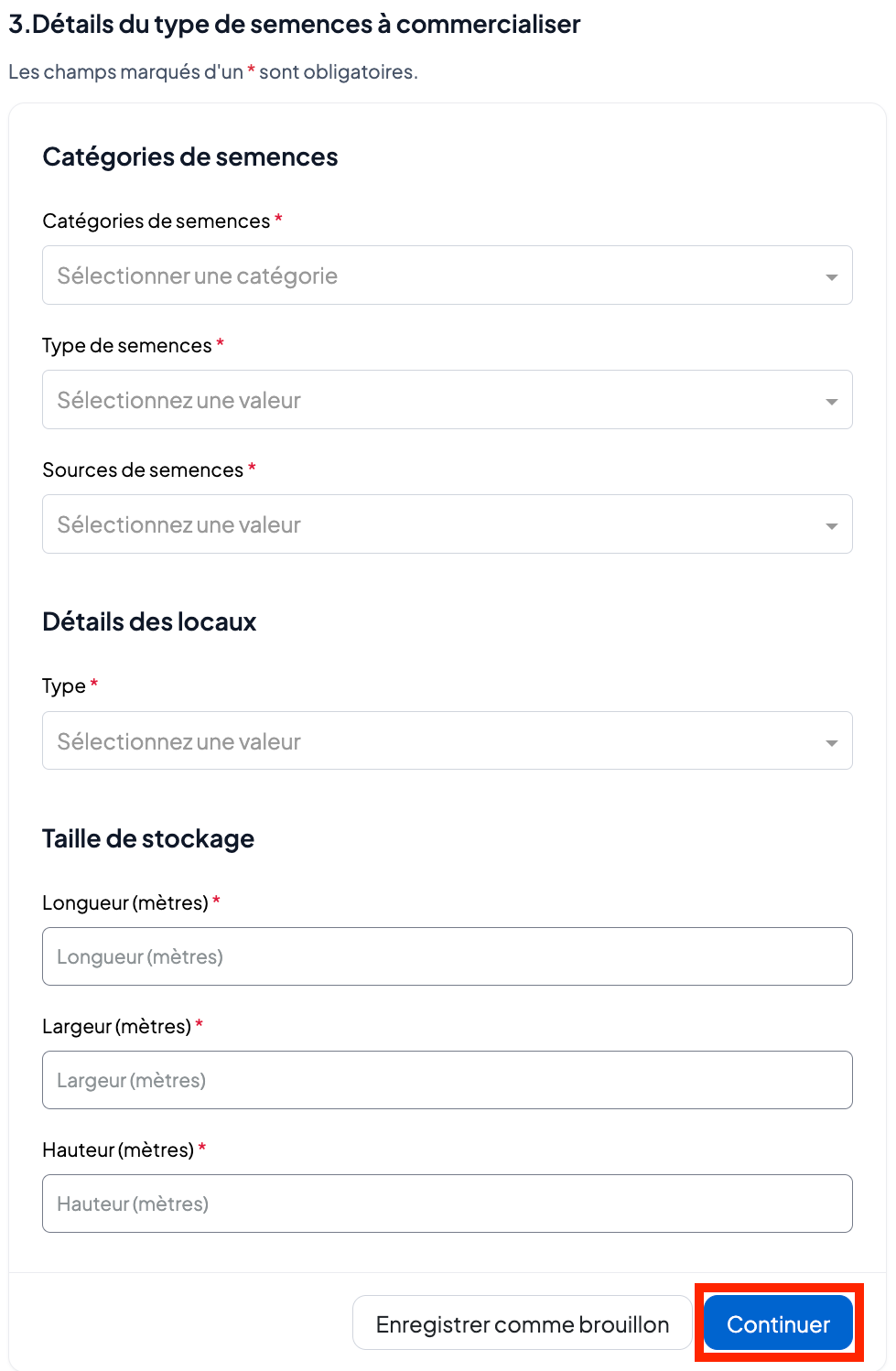 Saisissez les informations relatives au type de semences à commercialiser.