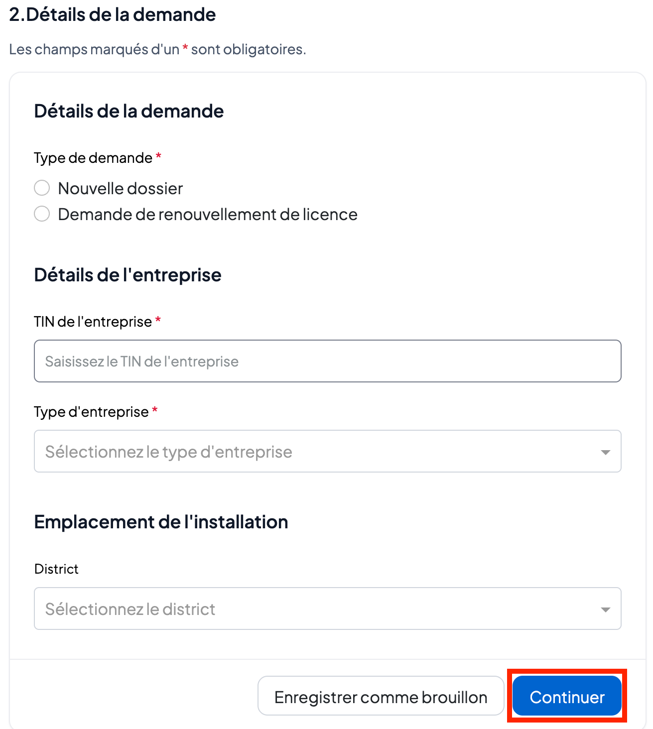 Saisissez les informations sur l’entreprise, sélectionnez s’il s’agit d’une nouvelle demande ou d’une demande de renouvellement de licence, et remplissez le TIN de l’entreprise. Sélectionnez le type d’activité ainsi que l’emplacement de l’établissement).
