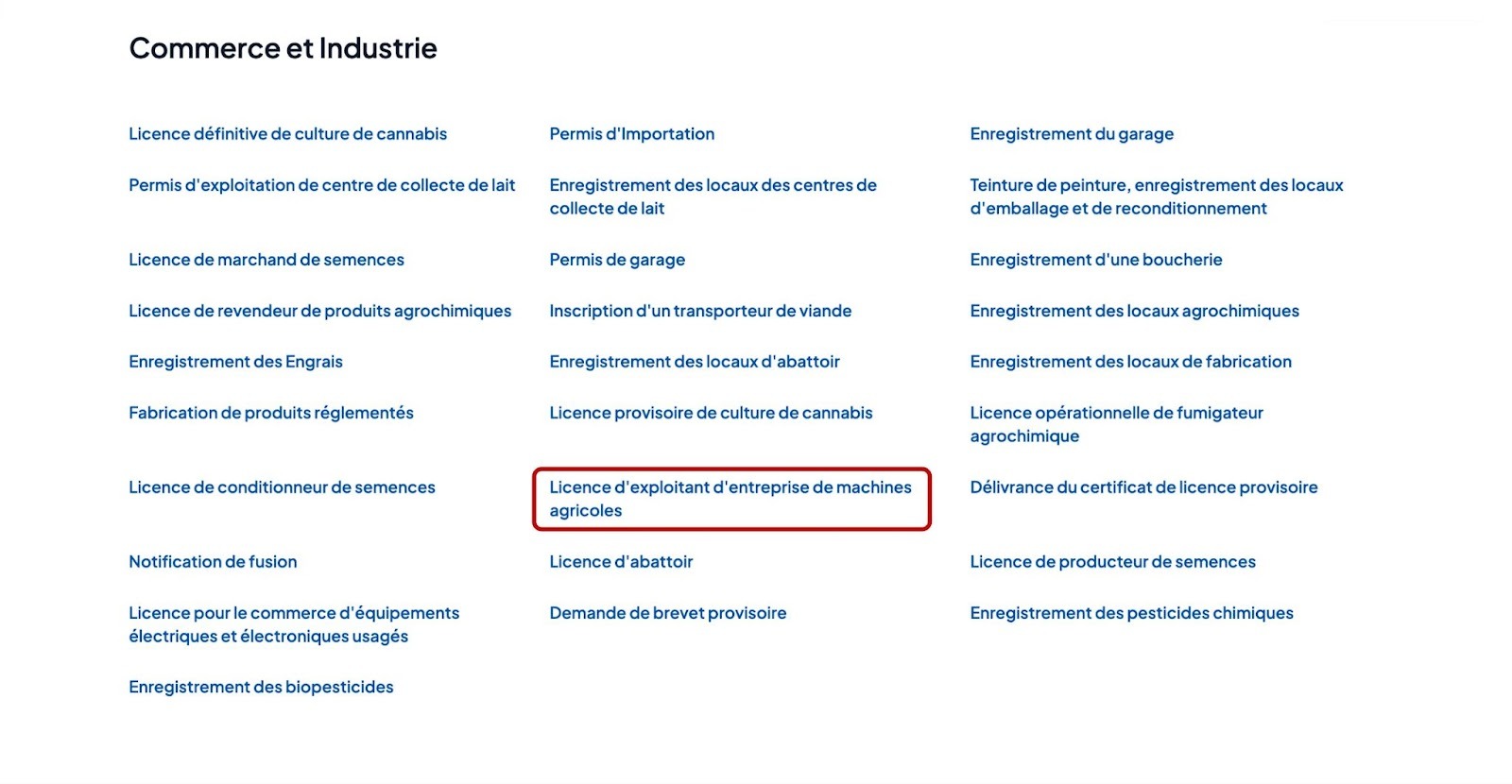 Sélectionnez “ Licence d'exploitant d'entreprise de machines agricoles ” ensuite cliquez sur “ Postulez ”.