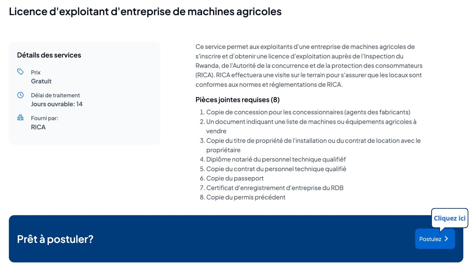 Ce service permet aux exploitants d'une entreprise de machines agricoles de s'inscrire et d'obtenir une licence d'exploitation auprès de l'Inspection du Rwanda, de l'Autorité de la concurrence et de la protection des consommateurs (RICA). RICA effectuera une visite sur le terrain pour s'assurer que les locaux sont conformes aux normes et réglementations de RICA.