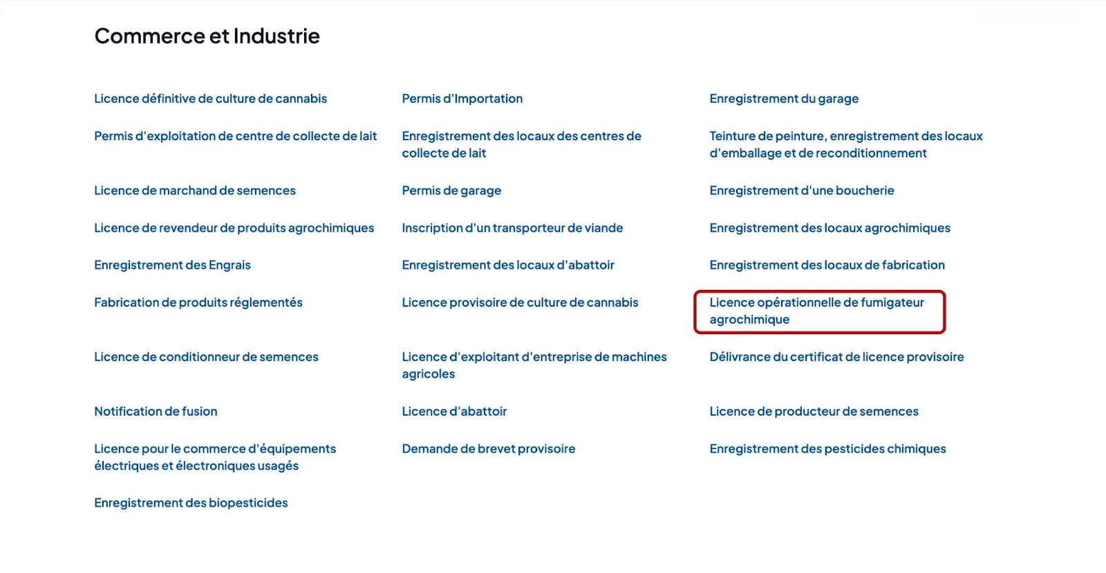 Accédez à la catégorie “Commerce et Industrie”, Ensuite cliquez sur “ Licence opérationnelle de fumigateur agrochimique “.