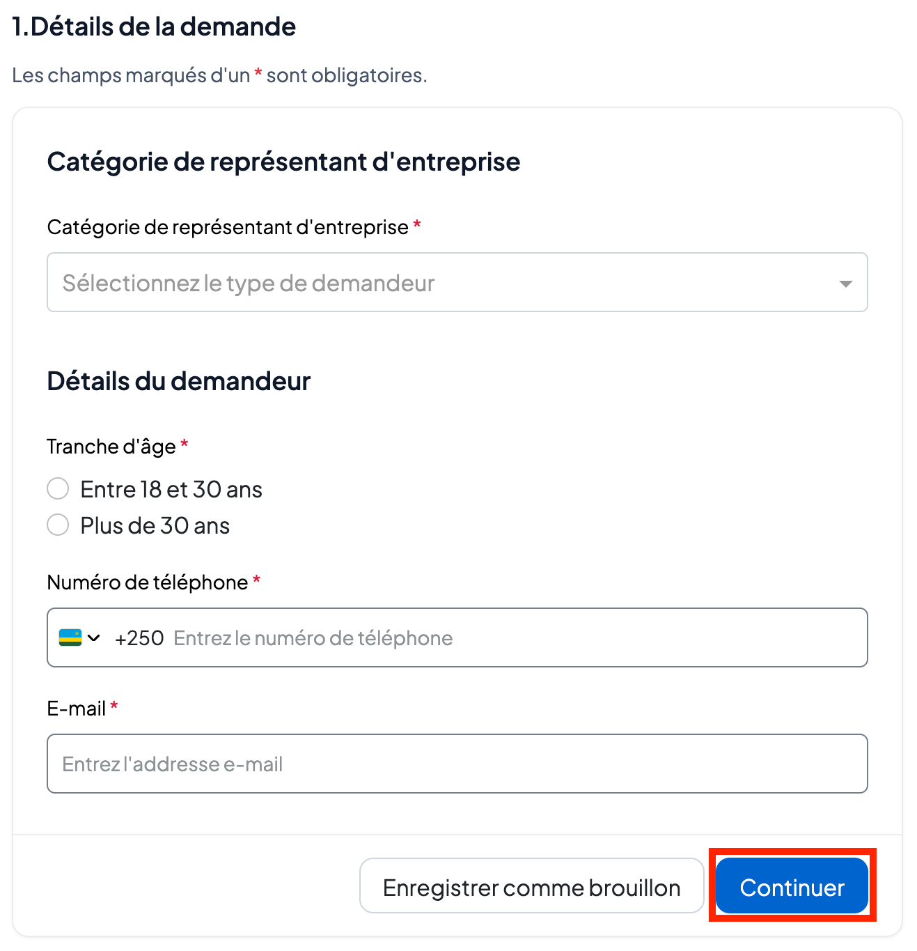 Remplissez les informations du demandeur (sélectionnez si le demandeur est le propriétaire de l’entreprise ou le représentant légal, ajoutez la tranche d’âge et les autres informations personnelles requises).