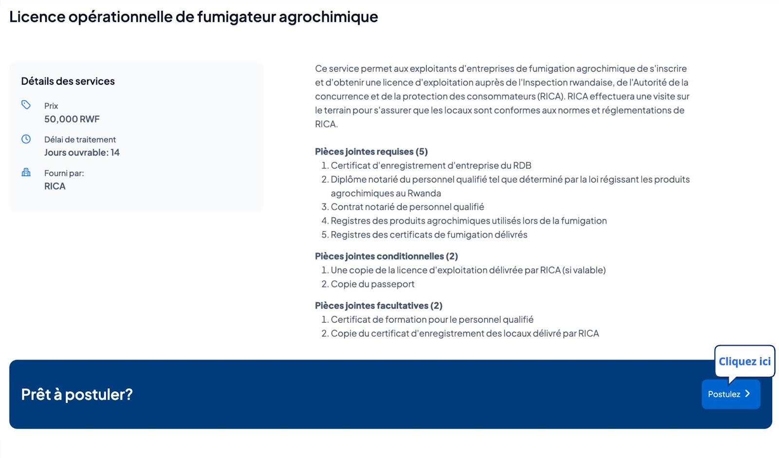 Ce service permet aux exploitants d'entreprises de fumigation agrochimique de s'inscrire et d'obtenir une licence d'exploitation auprès de l'Inspection rwandaise, de l'Autorité de la concurrence et de la protection des consommateurs (RICA). RICA effectuera une visite sur le terrain pour s'assurer que les locaux sont conformes aux normes et réglementations de RICA.