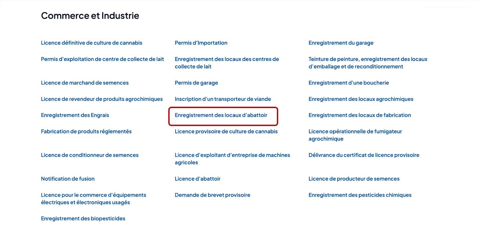 Accédez à la catégorie “Commerce et Industrie”, Ensuite cliquez sur “ Enregistrement des locaux d'abattoir“