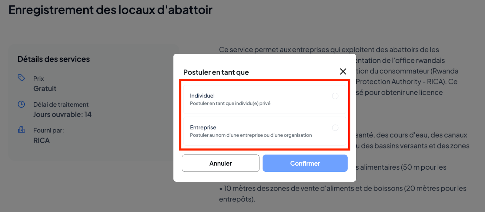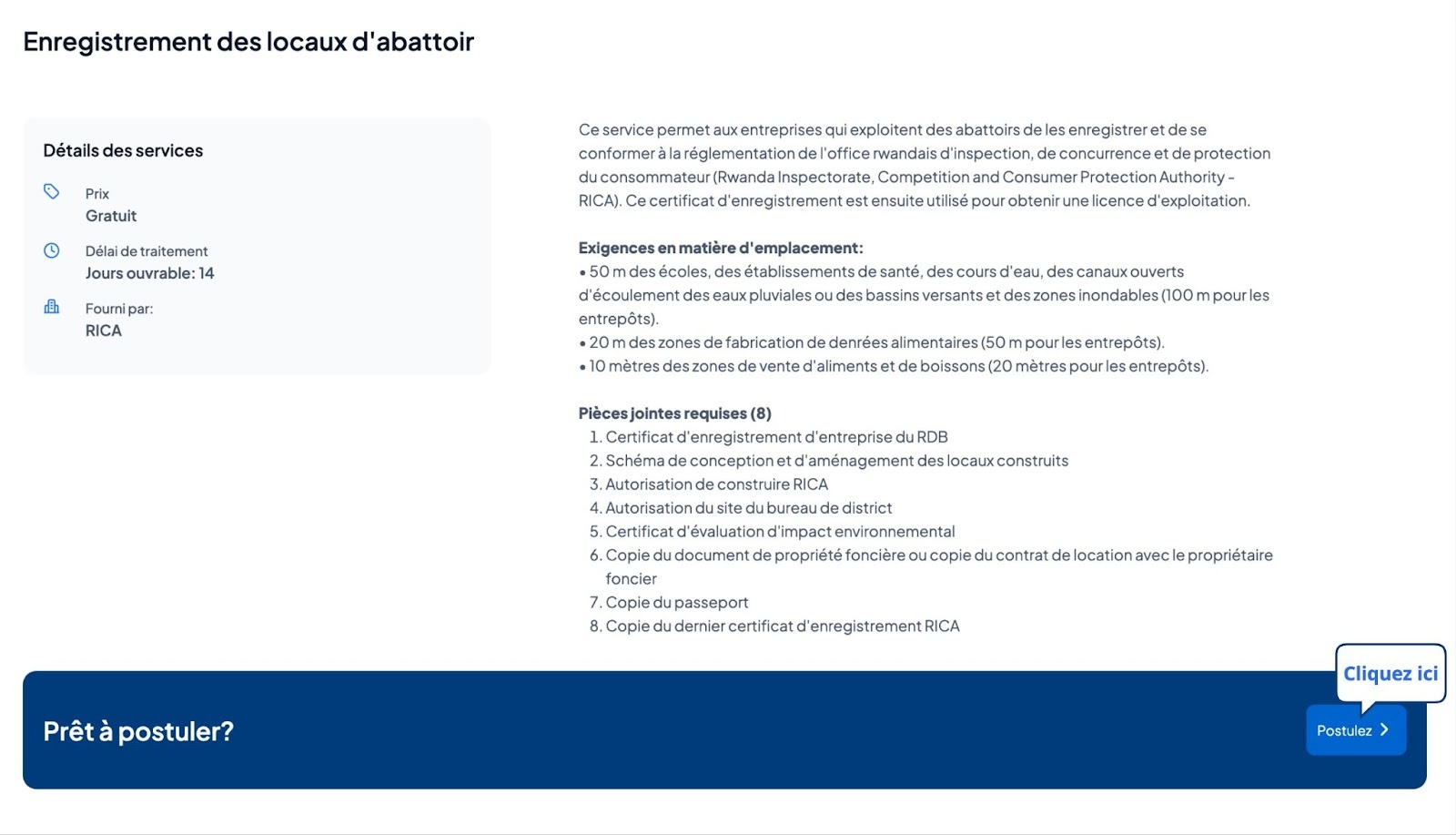 Ce service permet aux entreprises qui exploitent des abattoirs de les enregistrer et de se conformer à la réglementation de l'office rwandais d'inspection, de concurrence et de protection du consommateur (RICA). Ce certificat d'enregistrement est ensuite utilisé pour obtenir une licence d'exploitation.