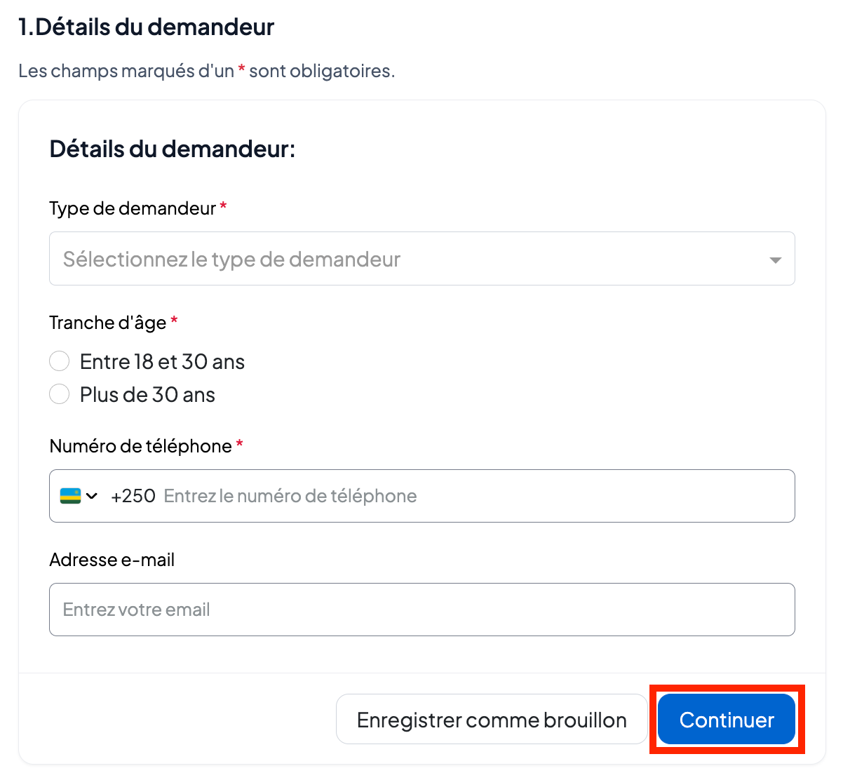 Remplissez les informations du demandeur (sélectionnez si le demandeur est le propriétaire de l’entreprise ou le représentant légal, ajoutez la tranche d’âge et les autres informations personnelles requises).