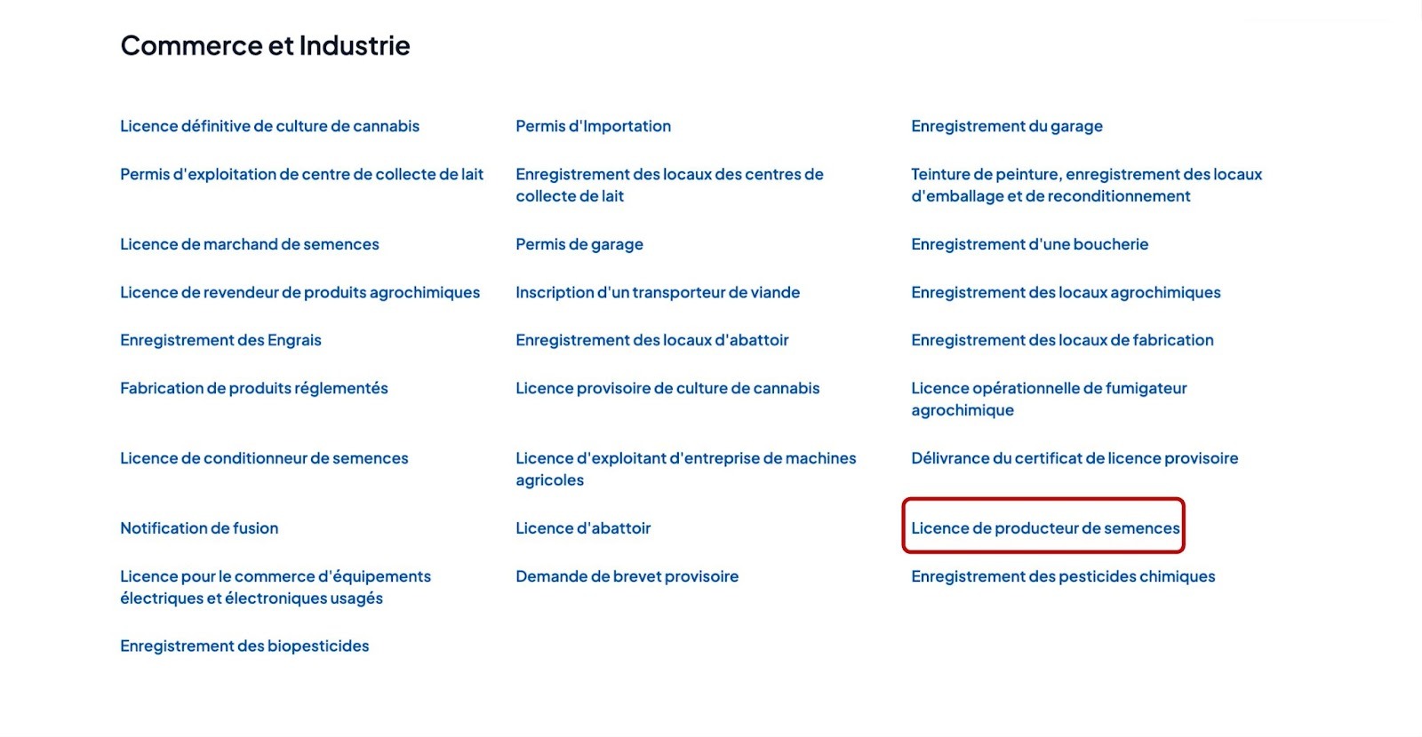 Accédez à la catégorie “Commerce et Industrie”, ensuite cliquez sur “Licence de producteur de semences”.