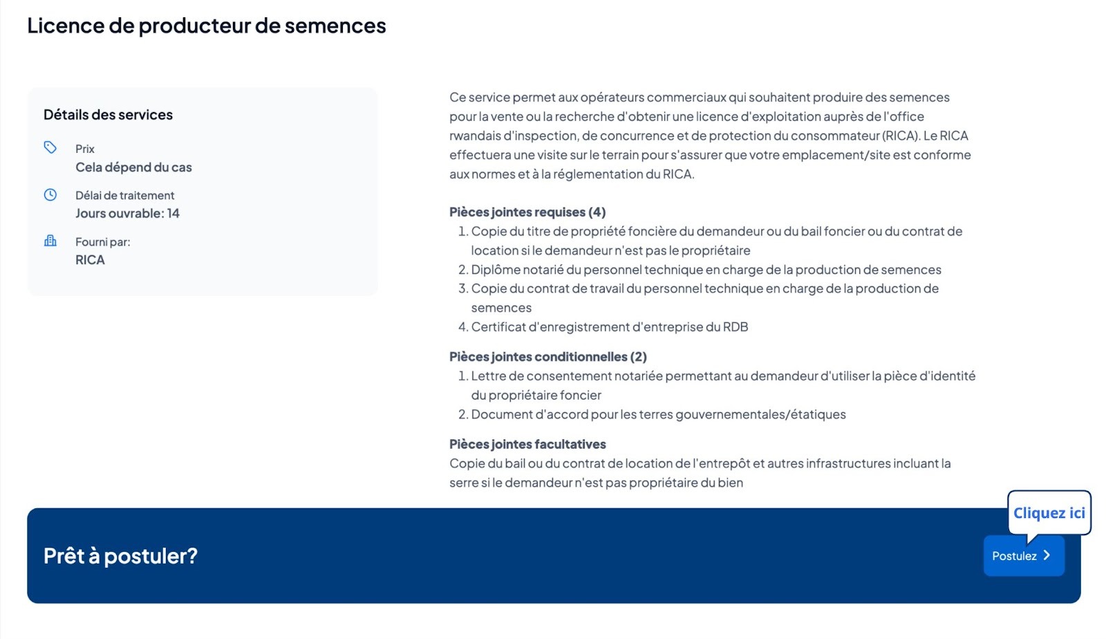 Ce service permet aux exploitants commerciaux souhaitant produire des semences à des fins de vente ou de recherche d’obtenir une licence d’exploitation auprès de l'office rwandais d'inspection, de concurrence et de protection du consommateur (RICA). RICA effectuera une visite de terrain afin de s’assurer que votre site respecte les normes et réglementations en vigueur.