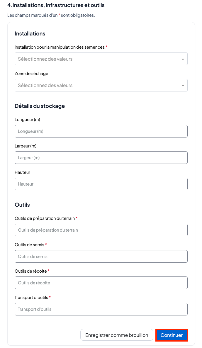 Remplissez les informations relatives aux installations, aux infrastructures et aux outils.