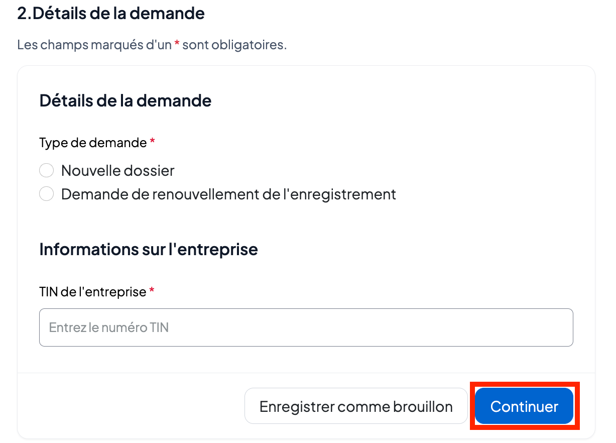 Sélectionnez s’il s’agit d’une nouvelle demande ou d’une demande de renouvellement d’enregistrement, puis renseignez le TIN de l’entreprise.
