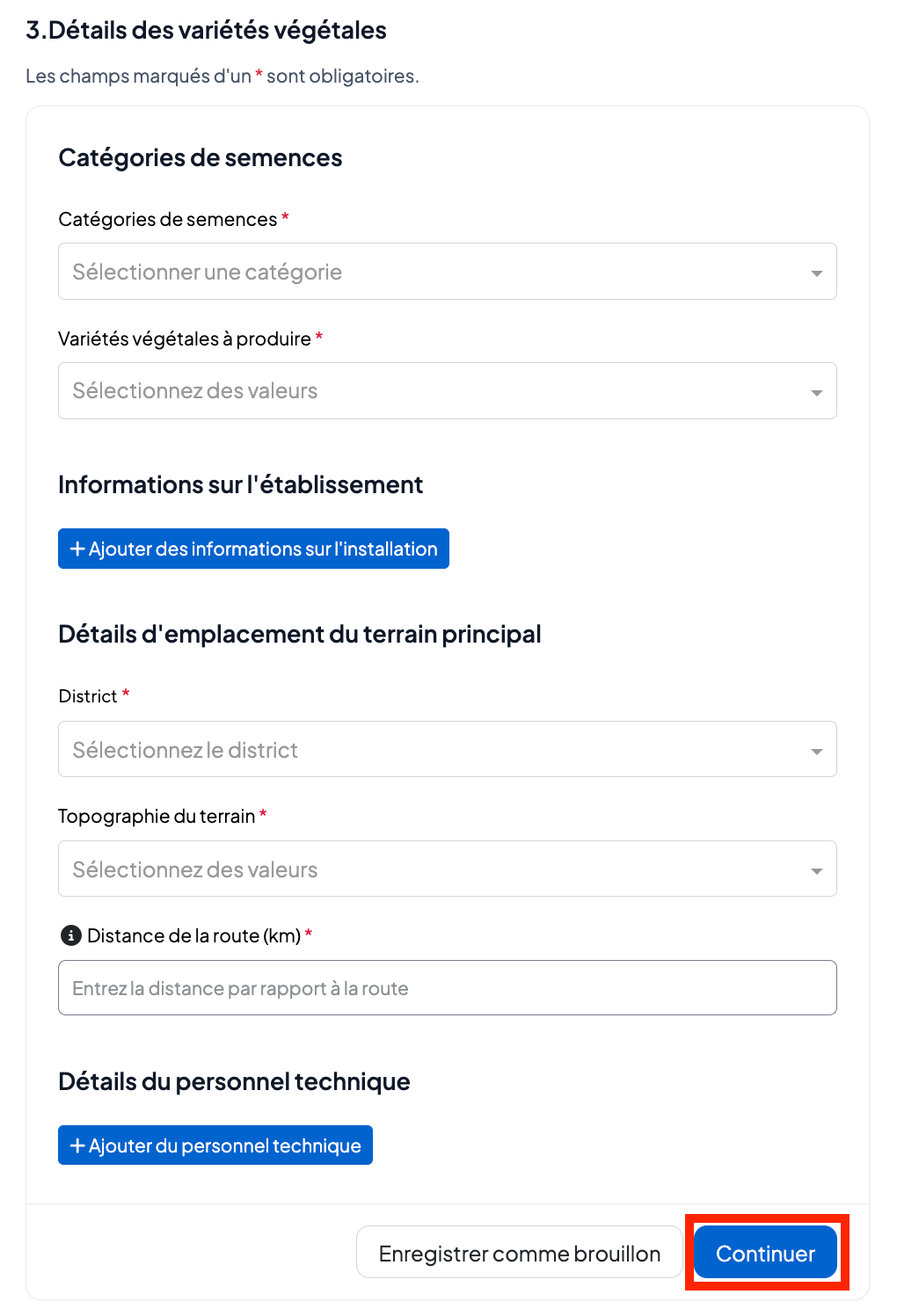Saisissez les détails des variétés végétales, les informations relatives au terrain et les informations concernant le personnel technique.