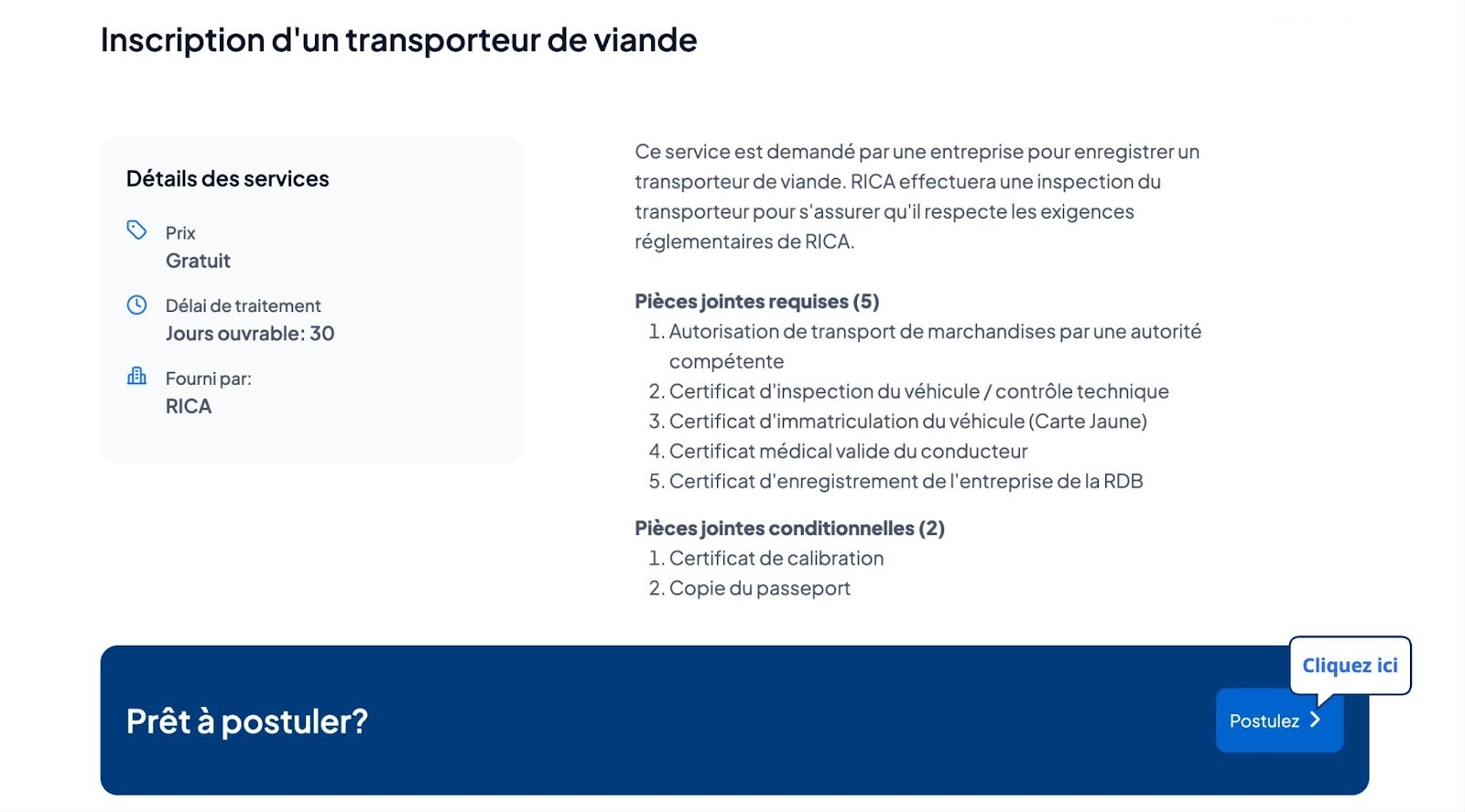 Ce service est demandé par une entreprise pour enregistrer un transporteur de viande. RICA effectuera une inspection du transporteur pour s'assurer qu'il respecte les exigences réglementaires de RICA. Ce service est fourni par l’office rwandais d'inspection, de concurrence et de protection du consommateur (RICA).