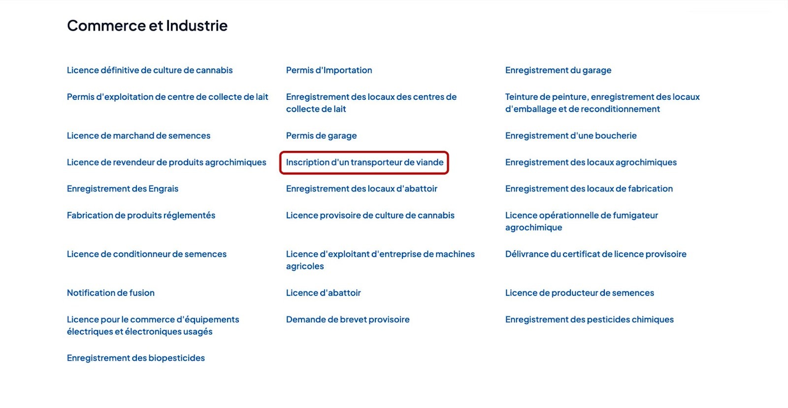 Accédez à la catégorie “Commerce et Industrie”, ensuite cliquez sur “Inscription d’un transporteur de viande”.