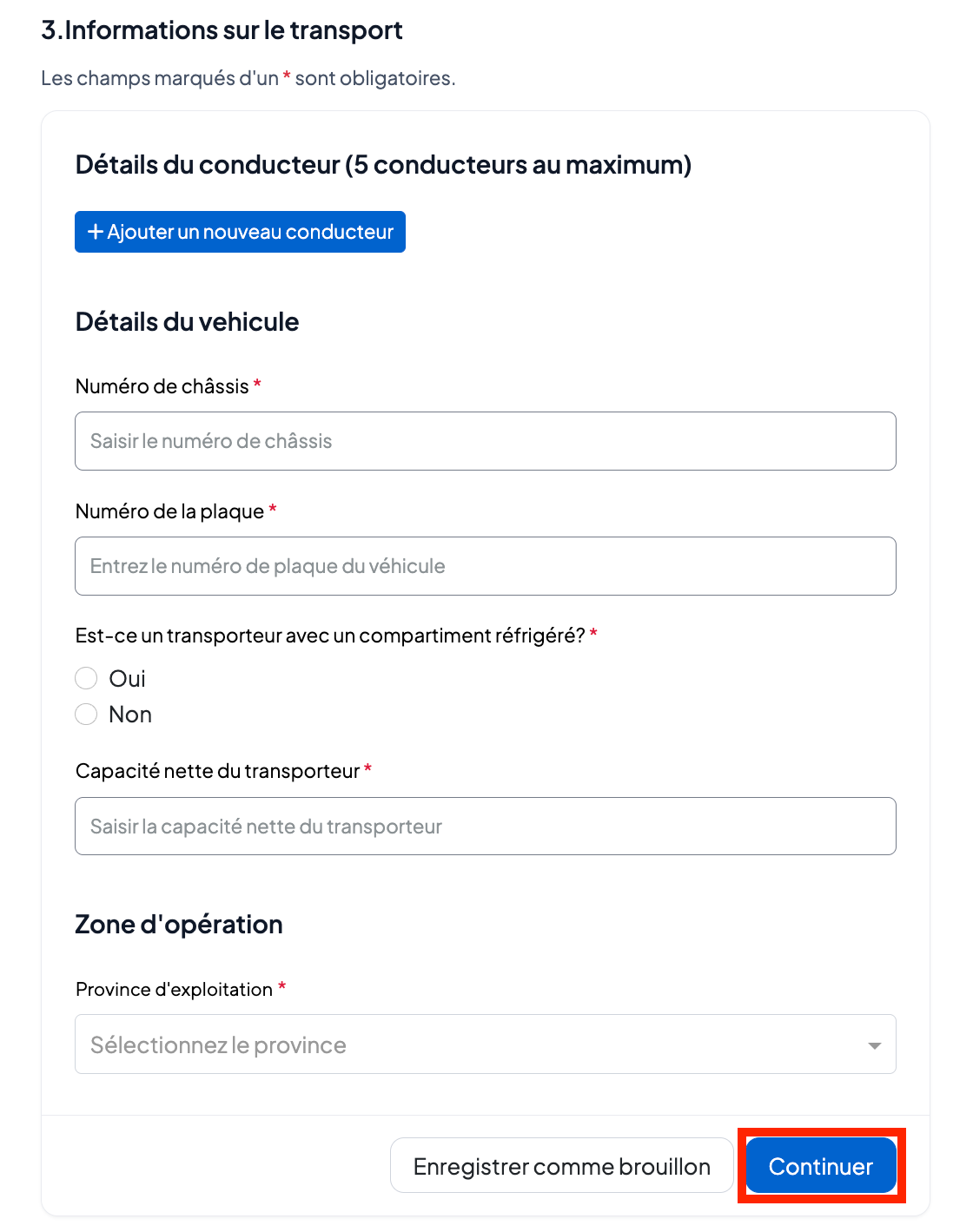 Fournissez les informations sur le transport et cliquez sur “ Ajouter un nouveau conducteur “ pour renseigner ses informations.