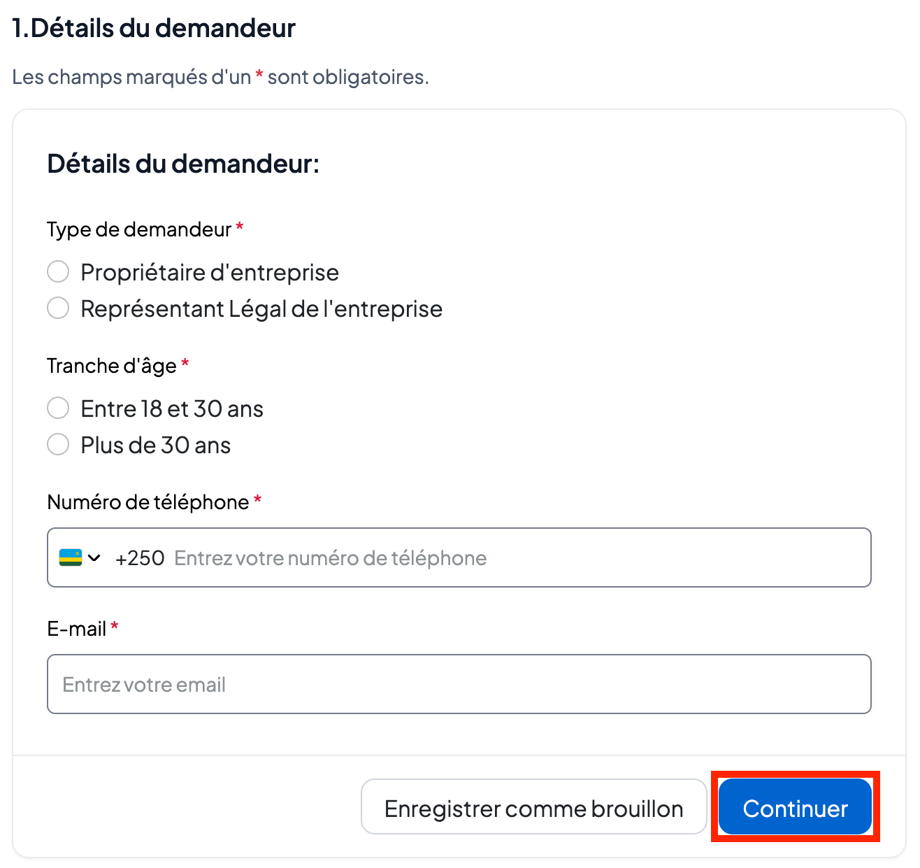 Remplissez les informations du demandeur (sélectionnez si le demandeur est le propriétaire de l’entreprise ou le représentant légal, ajoutez la tranche d’âge et les autres informations personnelles requises).