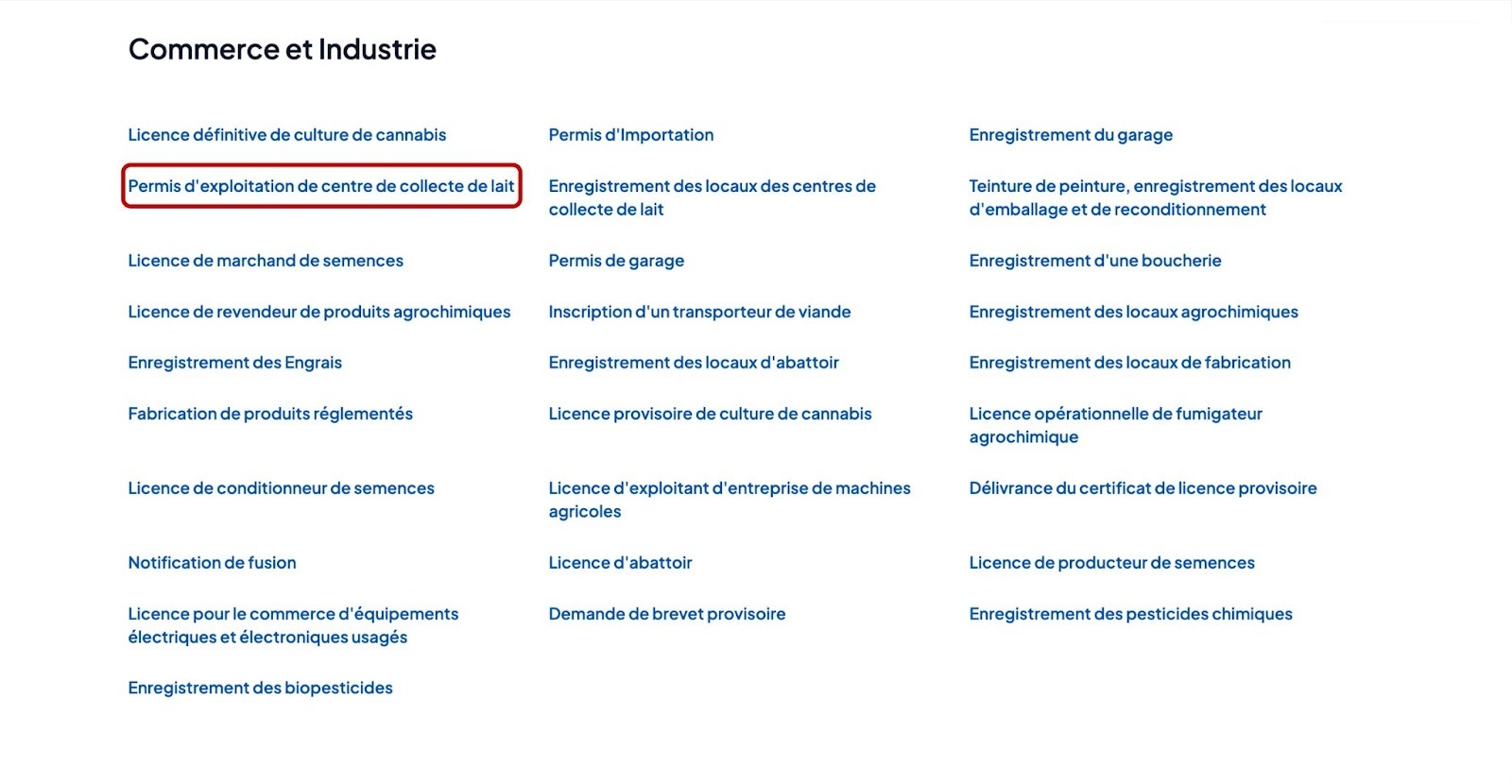 Accédez à la catégorie “Commerce et Industrie”, ensuite cliquez sur “ Permis d'exploitation de centre de collecte de lait”.