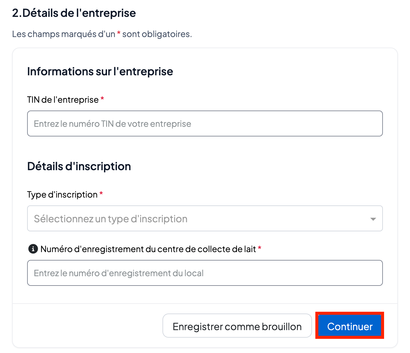 Saisissez les informations de l’entreprise (TIN), le type d’enregistrement, ainsi que le numéro d’enregistrement du Centre de collecte de lait s’il s’agit d’une nouvelle demande ou d’un renouvellement.