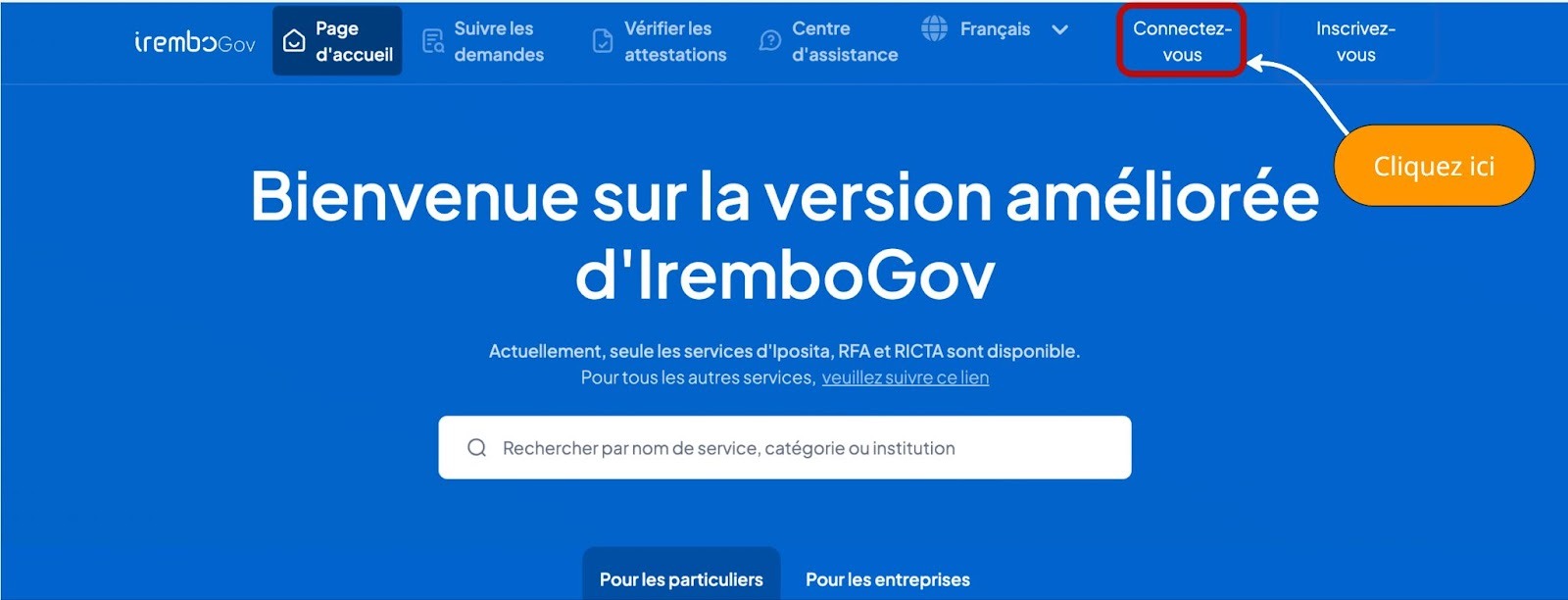 Visitez la plateforme IremboGov à l’adresse new.irembo.gov.rw et connectez-vous à votre compte. Si vous n'avez pas de compte, cliquez ici pour savoir comment en créer un.