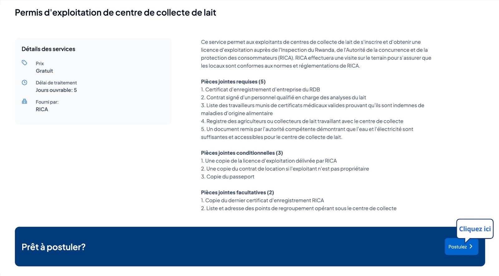 Ce service permet aux exploitants de centres de collecte de lait de s'inscrire et d'obtenir une licence d'exploitation auprès de l'Inspection du Rwanda, de l'Autorité de la concurrence et de la protection des consommateurs (RICA). RICA effectuera une visite sur le terrain pour s'assurer que les locaux sont conformes aux normes et réglementations de RICA.
