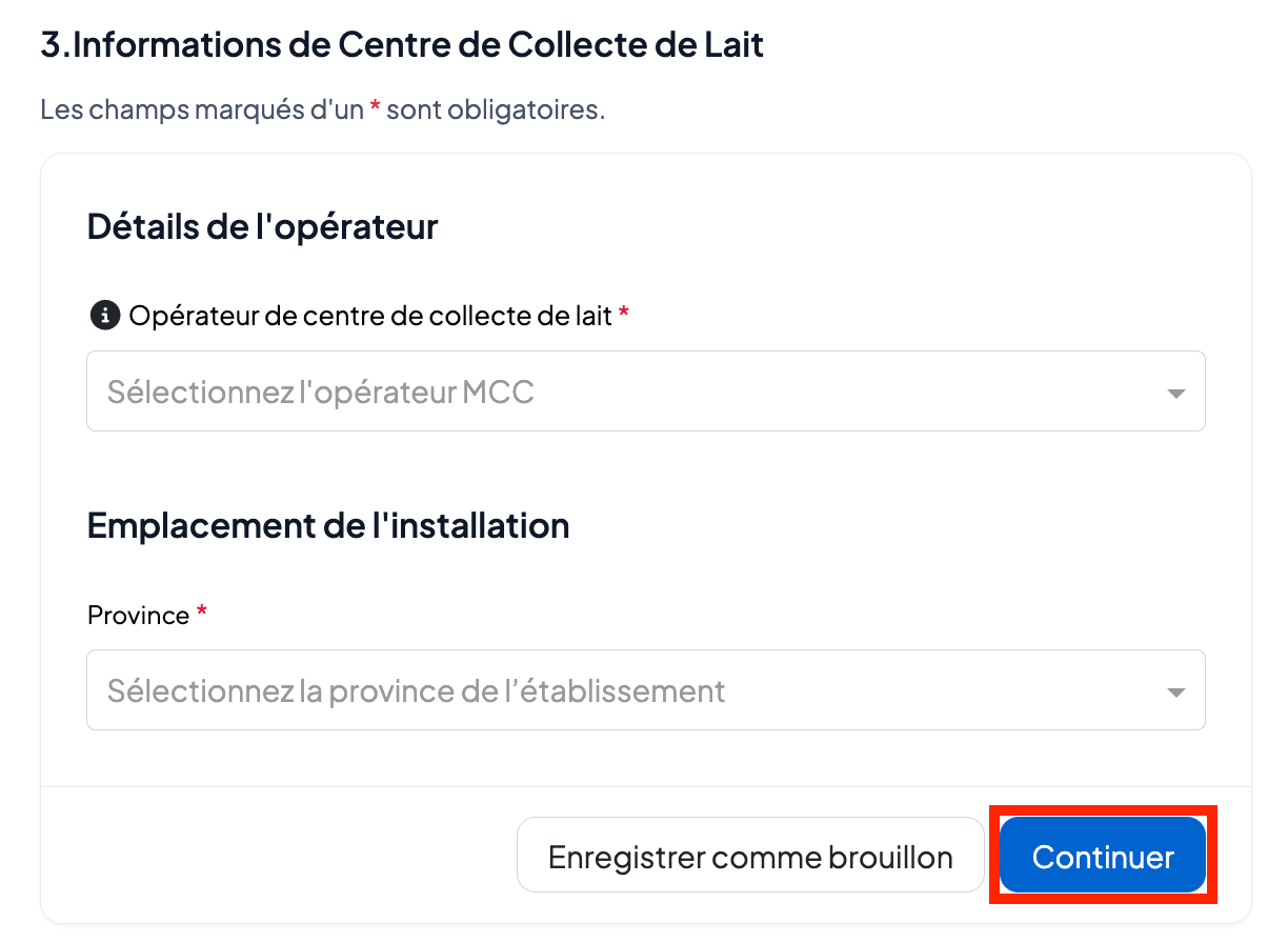 Remplissez les informations du centre de collecte de lait (détails de l’exploitant et localisation).