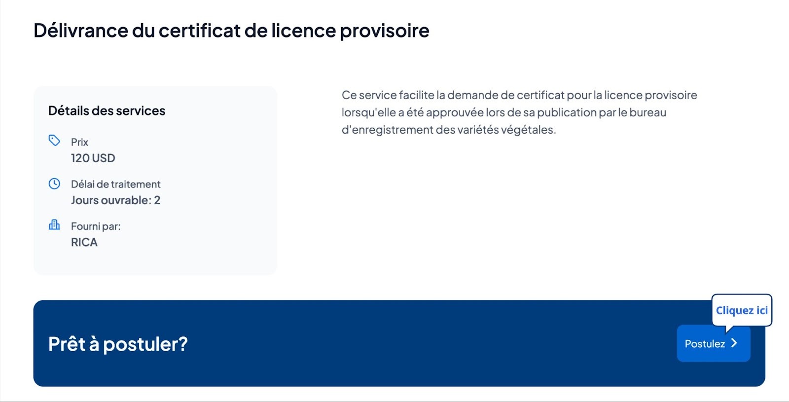 Ce service facilite la demande de certificat pour la licence provisoire lorsqu'elle a été approuvée lors de sa publication par le bureau d'enregistrement des variétés végétales.Le service est fourni par l’Office Rwandais d’Inspection, de Concurrence et de Protection du Consommateur (RICA).