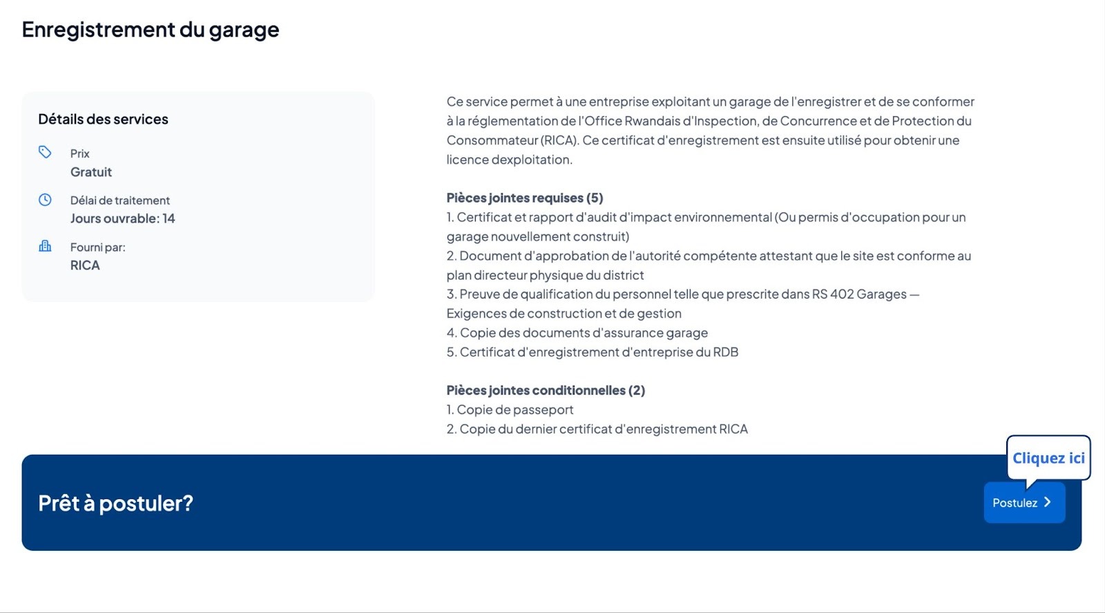 Ce service permet à une entreprise exploitant un garage de l'enregistrer et de se conformer à la réglementation de l'Office Rwandais d'Inspection, de Concurrence et de Protection du Consommateur (RICA). Ce certificat d'enregistrement est ensuite utilisé pour obtenir une licence d'exploitation.
