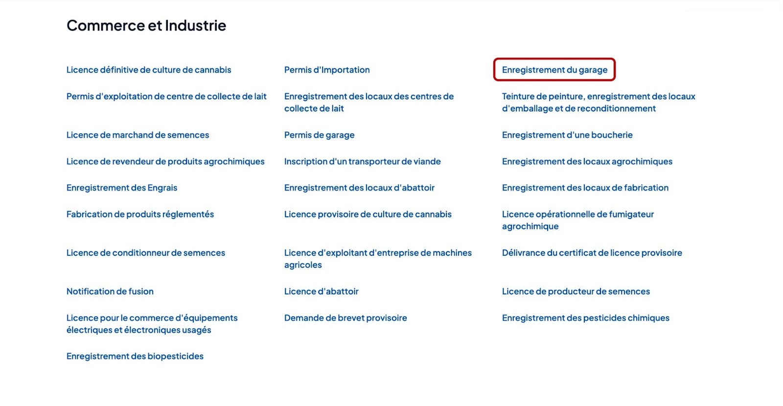 Accédez à la catégorie “Commerce et Industrie”, Ensuite cliquez sur “ “Enregistrement du garage“.