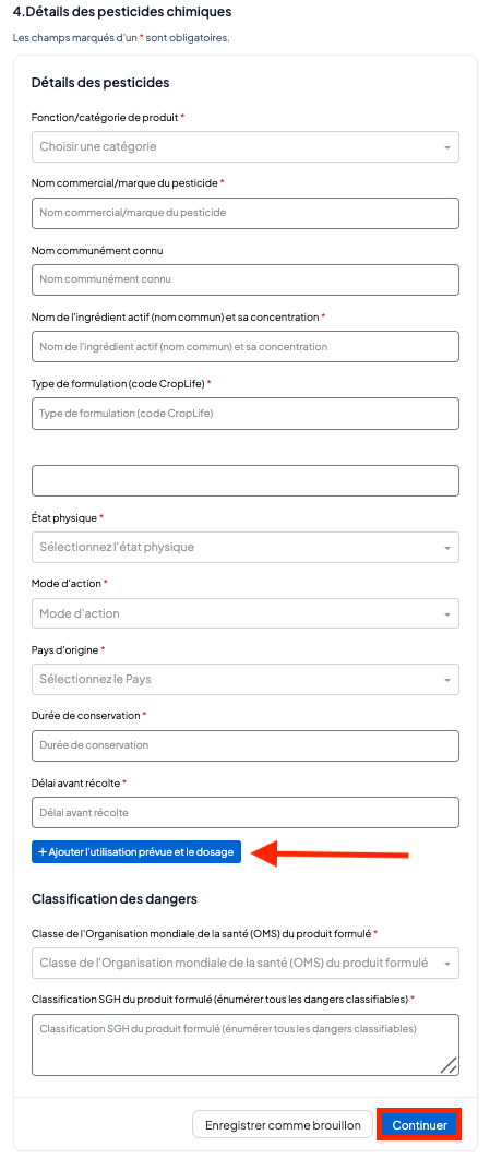 Note: Une fois que vous cliquez sur “ Ajouter l’utilisation prévue et le dosage “, un nouvel onglet s’affiche. Remplissez les informations demandées.