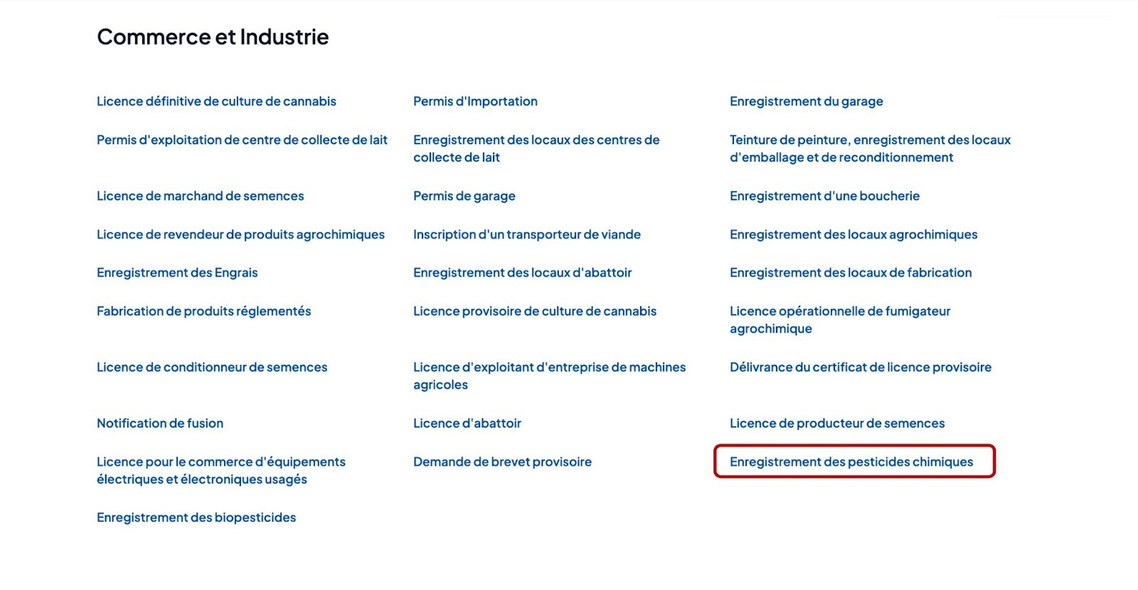Accédez à la catégorie “Commerce et Industrie”, ensuite cliquez sur “Enregistrement des pesticides chimiques”.