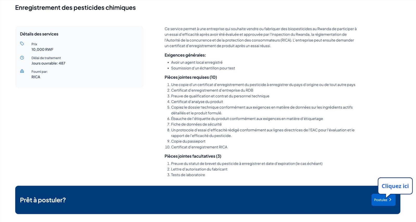 Ce service permet à une entreprise qui souhaite vendre ou fabriquer des biopesticides au Rwanda de participer à un essai d'efficacité après avoir été évaluée et approuvée par l’Office Rwandais d’Inspection, de Concurrence et de Protection du Consommateur(RICA). L'entreprise peut ensuite demander un certificat d'enregistrement de produit après un essai réussi.