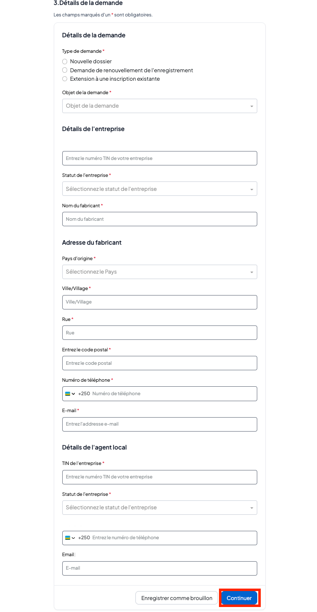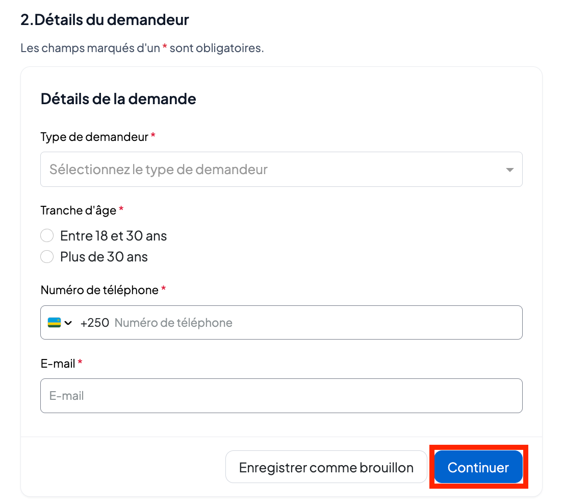 Renseignez les informations du demandeur (sélectionnez si le demandeur est le propriétaire de l’entreprise ou son représentant légal, ajoutez la tranche d’âge ainsi que les autres renseignements requis).