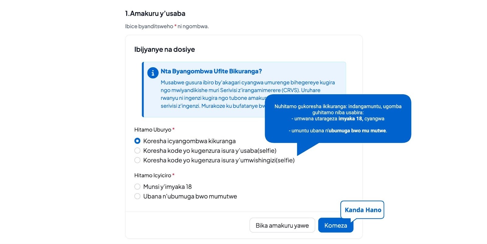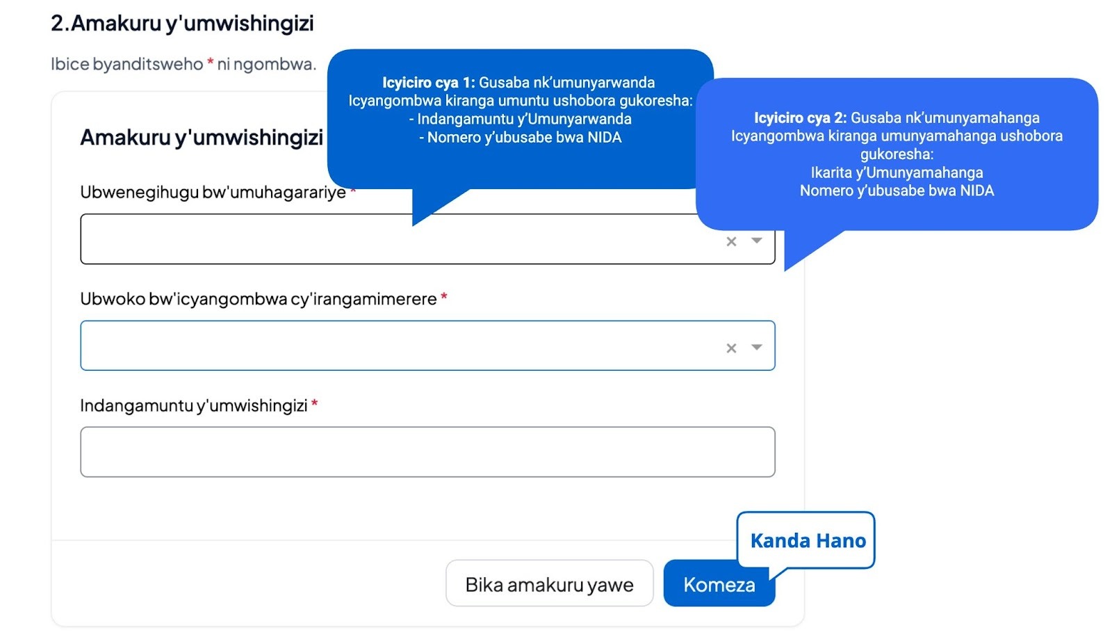 Ugomba kuba ufite Indangamuntu y’Umunyarwanda, Indangamuntu y’Umunyamahanga, cyangwa nimero y’ubusabe itangwa na NIDA.