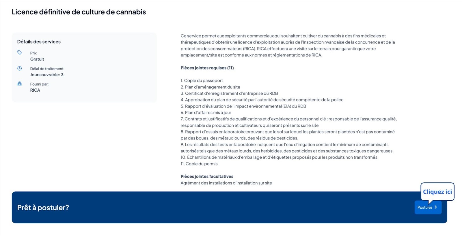 Sélectionnez “Licence définitive de culture de cannabis” ensuite cliquez sur “Postulez”.