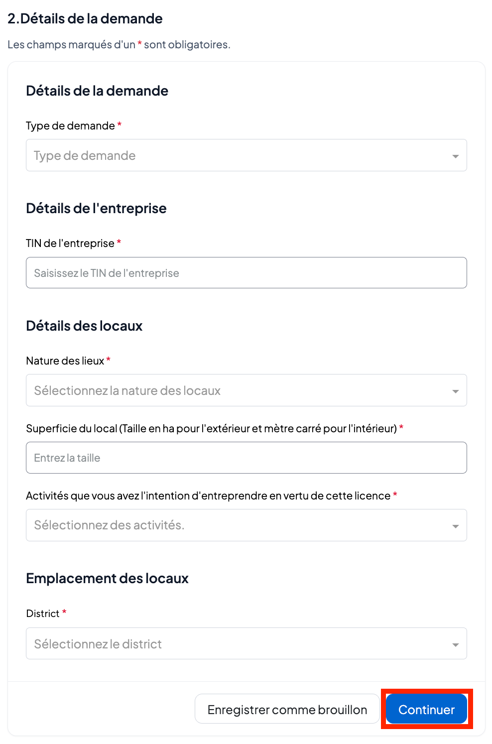 Saisissez les détails de la demande (ajoutez le type de demande, c’est-à-dire s’il s’agit d’une nouvelle demande ou d’un renouvellement, le numéro d’identification fiscale (TIN) de l’entreprise, la nature des lieux, la superficie des locaux, les activités que vous comptez exercer dans le cadre de cette licence et l’emplacement des locaux).