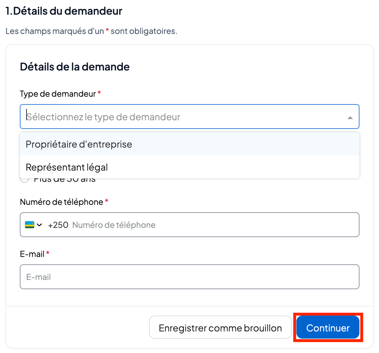 Remplissez les informations du demandeur (sélectionnez si le demandeur est le propriétaire de l’entreprise ou le représentant légal, ajoutez la tranche d’âge et les autres informations personnelles requises).